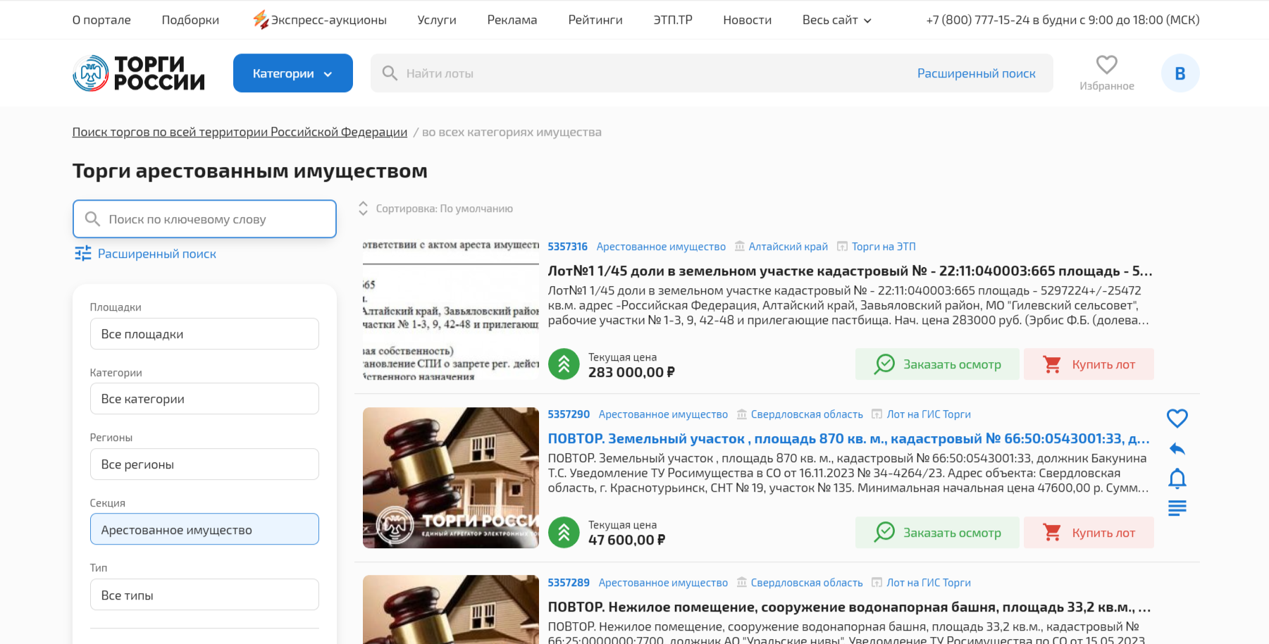 На сайтах-агрегаторах также можно искать лоты с торгов арестованным имуществом. Например, на портале “Торги России” в поле “Секция” нужно выбрать пункт “арестованное имущество”, и среди открывшегося списка выбрать желанный лот.