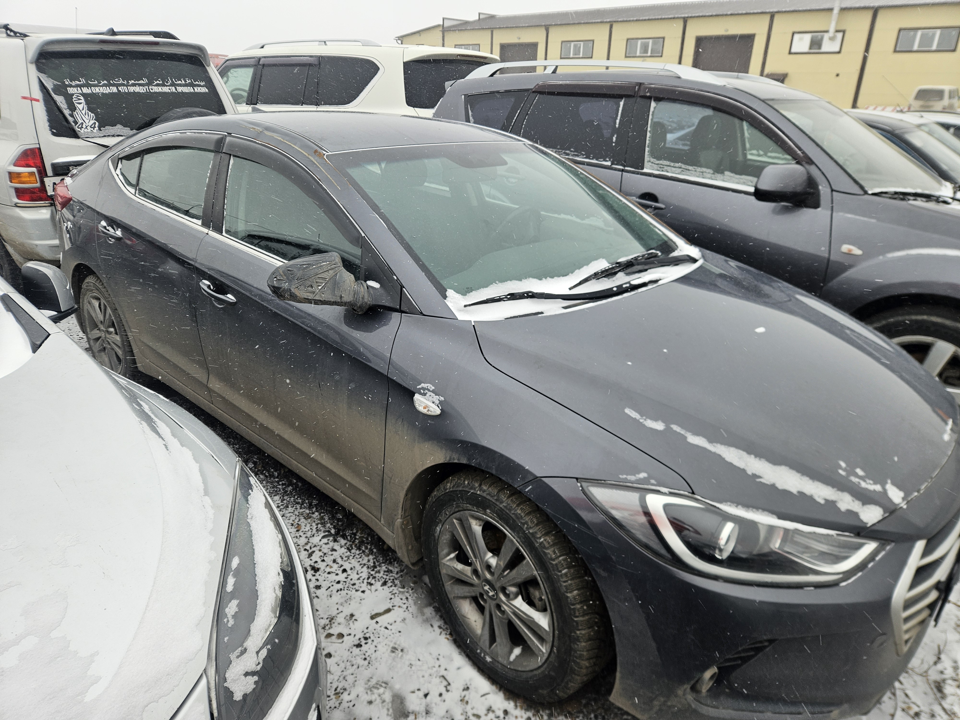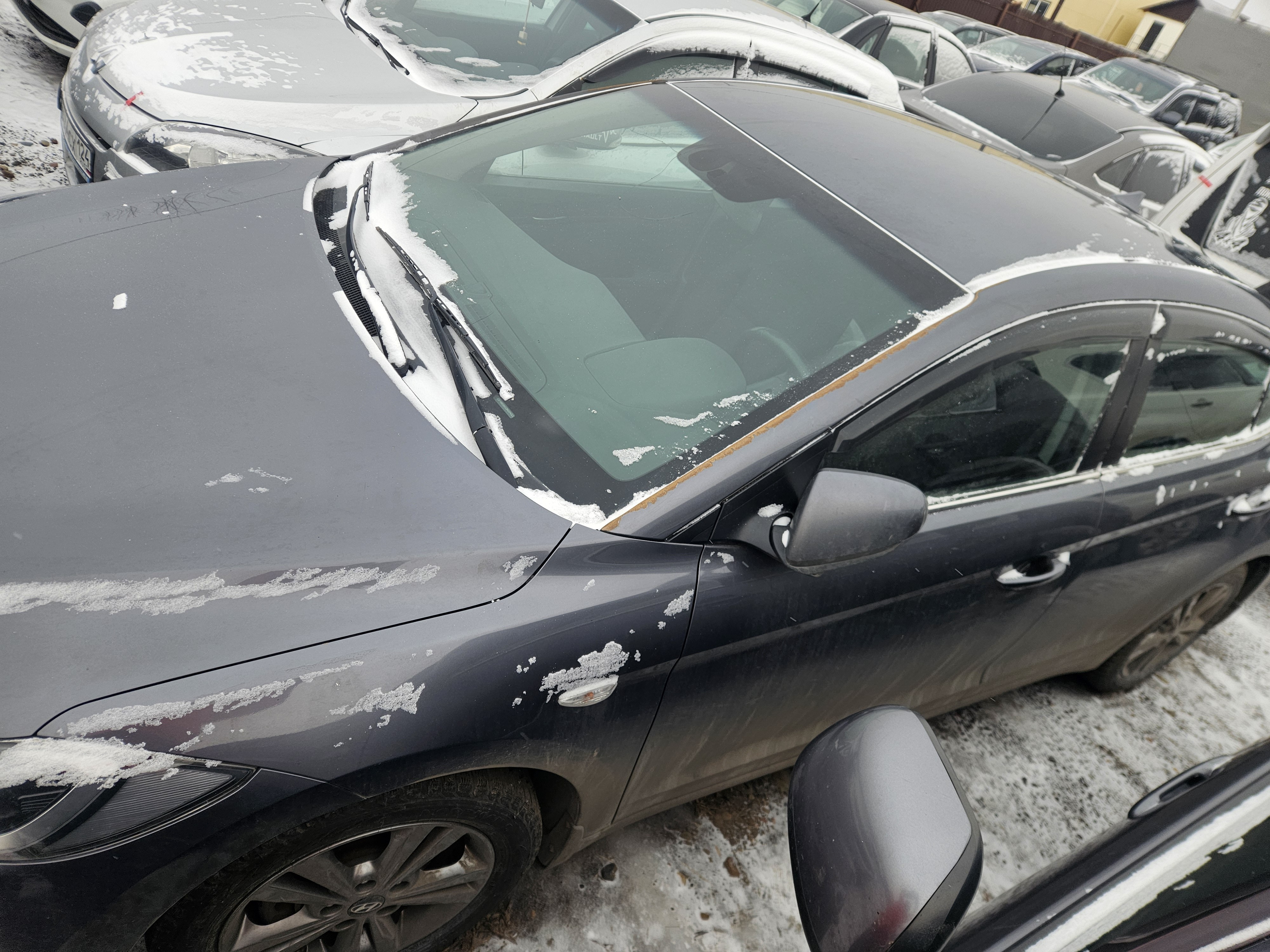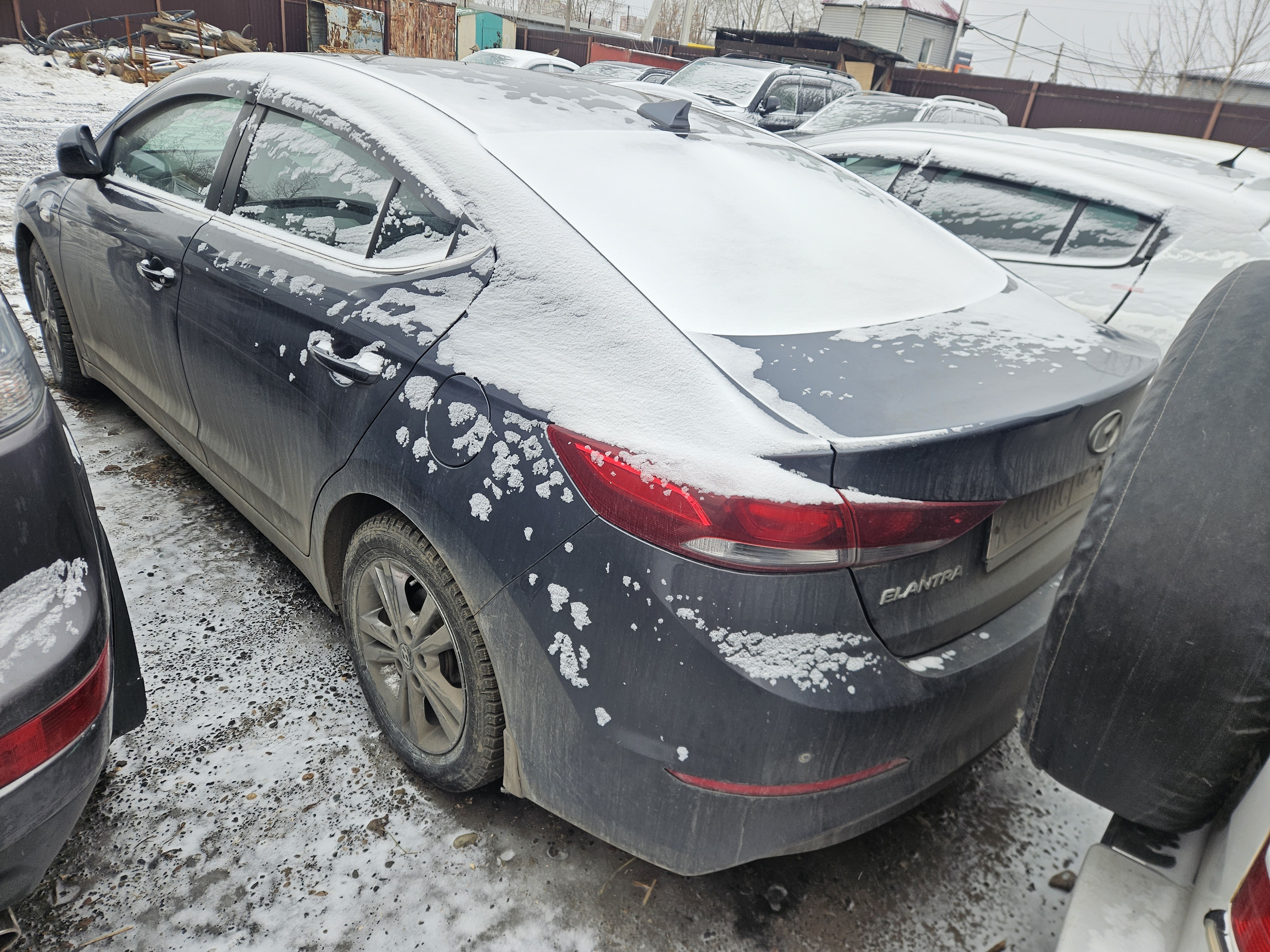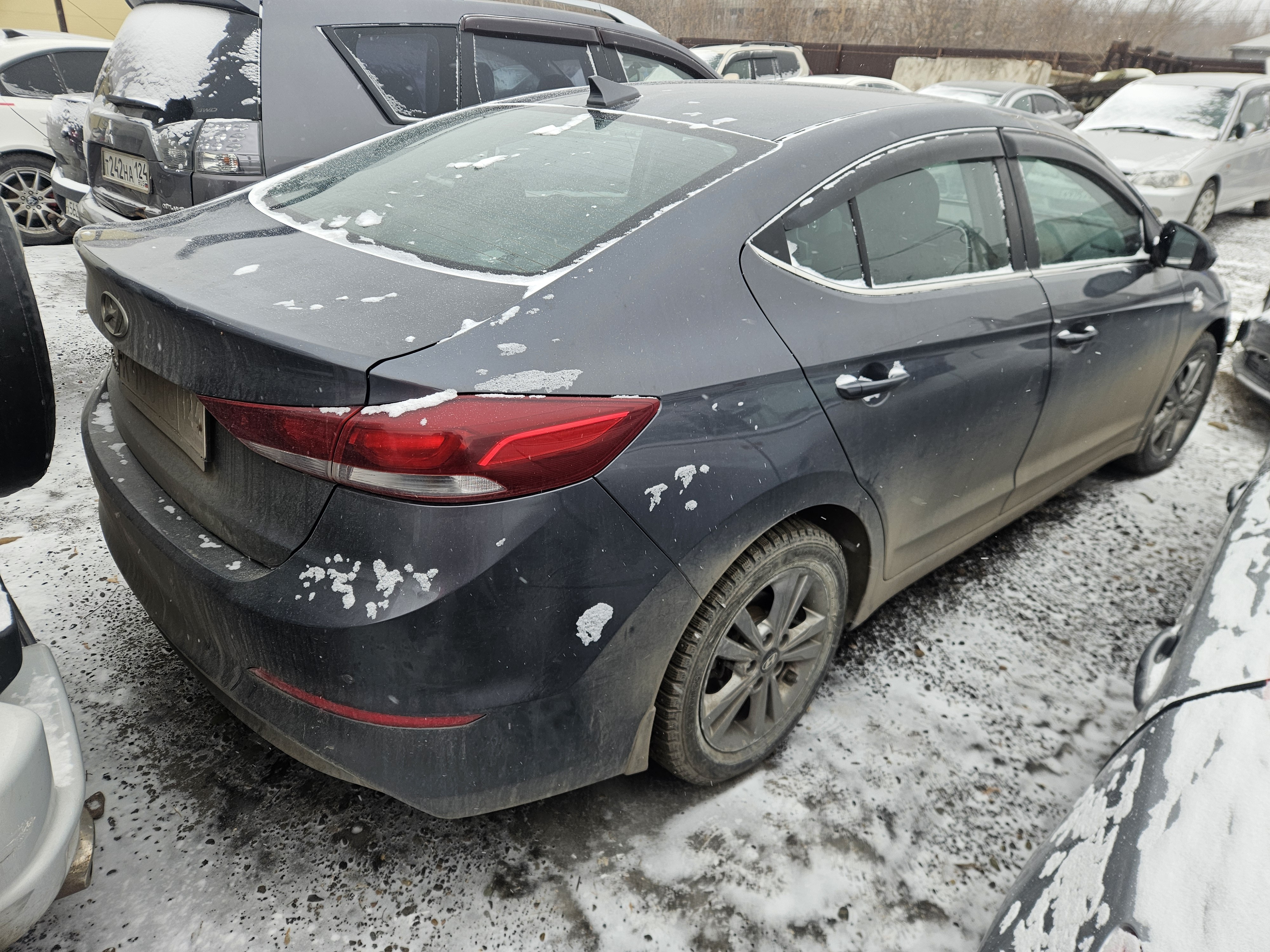 Автомобиль Hyundai Elantra в удовлетворительном состоянии. Запустить двигатель, осмотреть подкапотное пространство, багажное отделение и салон не удалось по причине отсутствия ключей. На момент осмотра автомобиль в загрязненном состоянии (присутствует слой наледи). Кузов автомобиля с множественными повреждениями: ➢правое дверное зеркало- разрушение ➢передний бампер- царапины, разрушение, сколы, трещины ➢крыша- коррозия, сколы ➢левая стойка- коррозия, сколы ➢правая стойка- коррозия, сколы ➢ветровое стекло- трещина ➢заднее правое крыло- царапины, коррозия, сколы ➢задняя правая дверь- царапины ➢заднее левое крыло- коррозия, сколы ➢крышка багажника- вмятина, сколы Вторично окрашены: ➢заднее левое крыло Фары, задние фонари, стекла визуально в удовлетворительном состоянии, имеются дефекты в виде царапин, трещины. Разрушение правого дверного зеркала. На ветровом стекле имеется трещина. Зимние шины в неудовлетворительном состоянии. Легкосплавные диски в удовлетворительном состоянии, имеются дефекты эксплуатации в виде царапин, сколов. Данный отчет актуален на момент осмотра. Автоэксперт не даёт гарантии на возможные будущие неисправности/поломки/ошибки. Автоэксперт не гарантирует отсутствие дополнительных скрытых дефектов и точность показаний ЛКП.