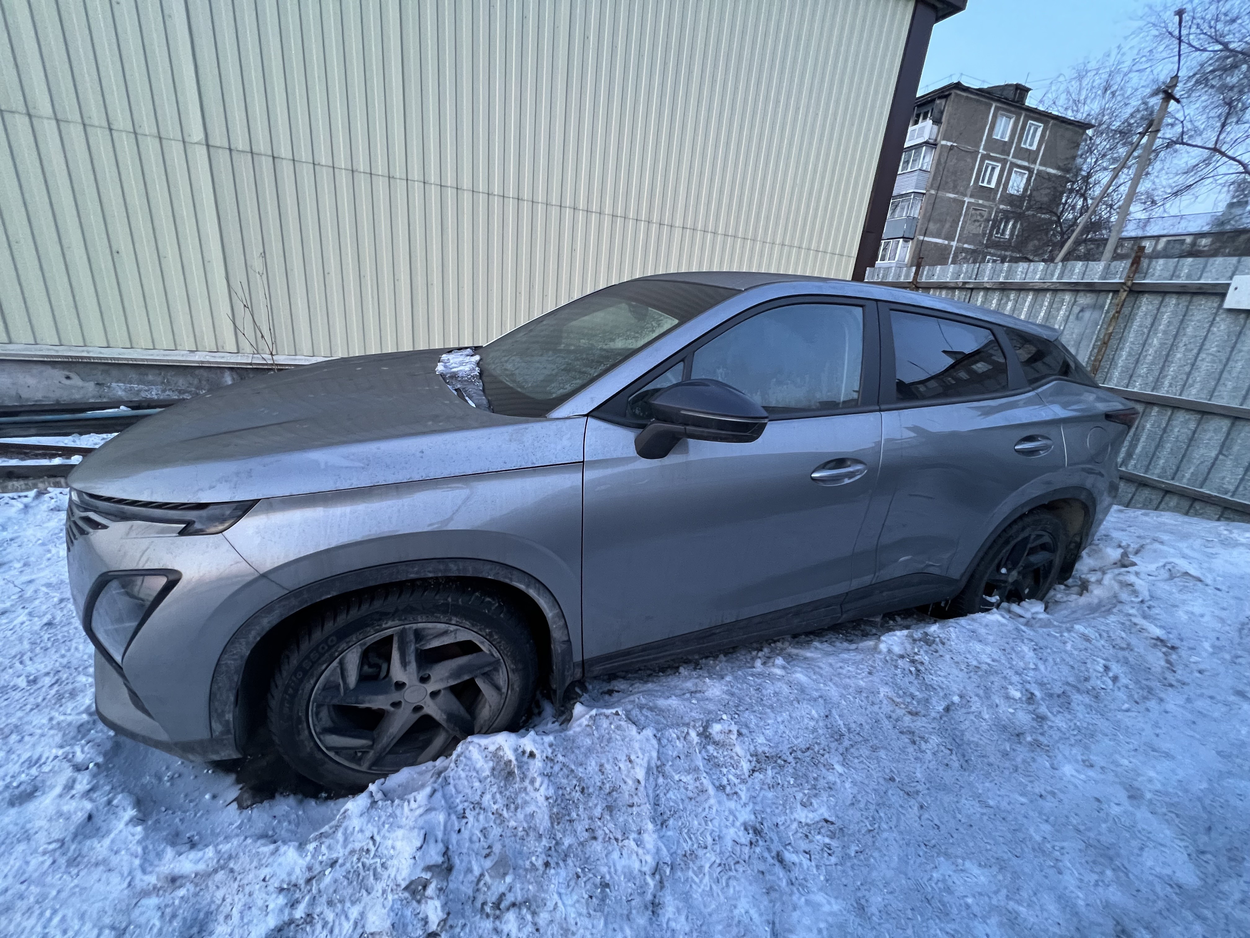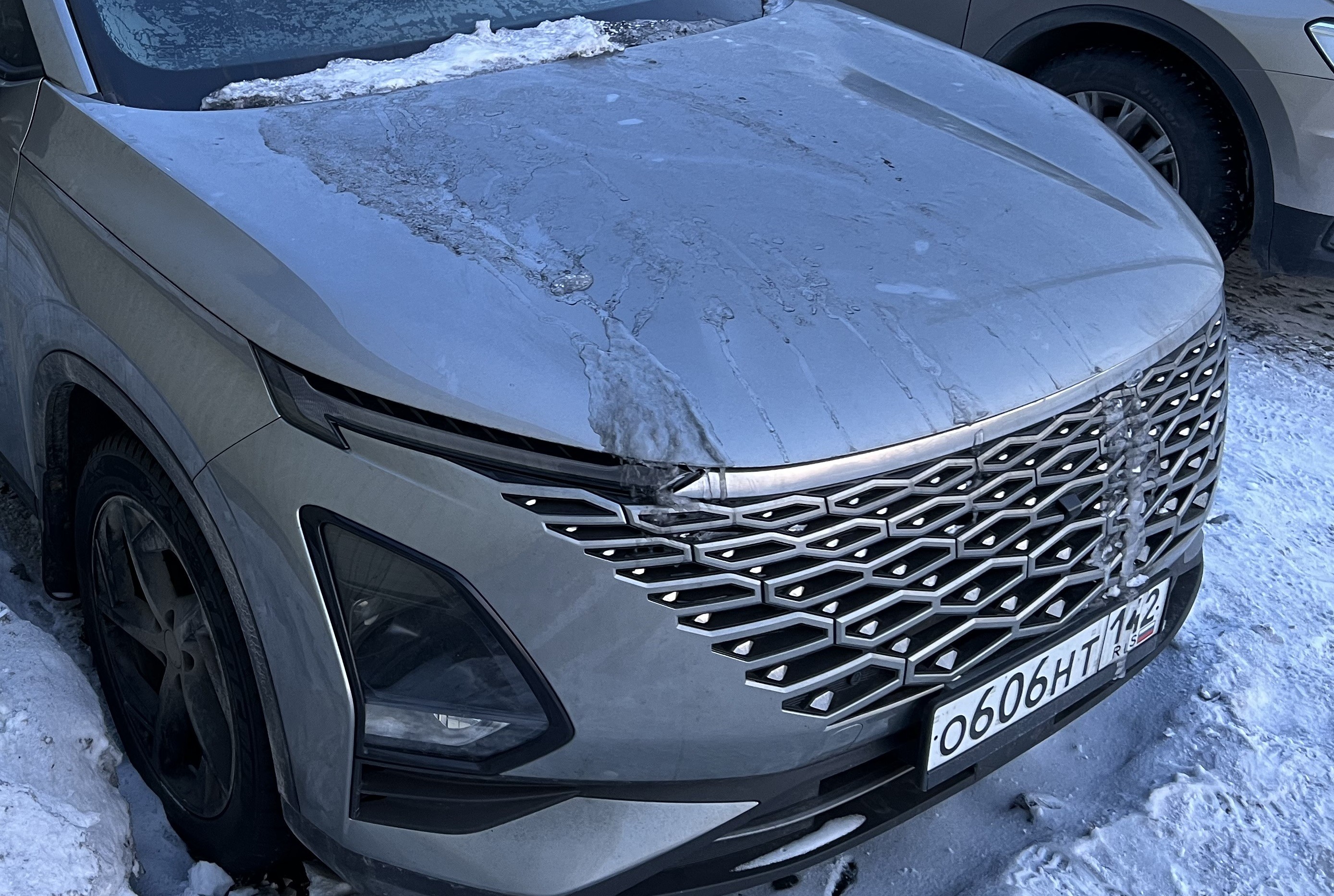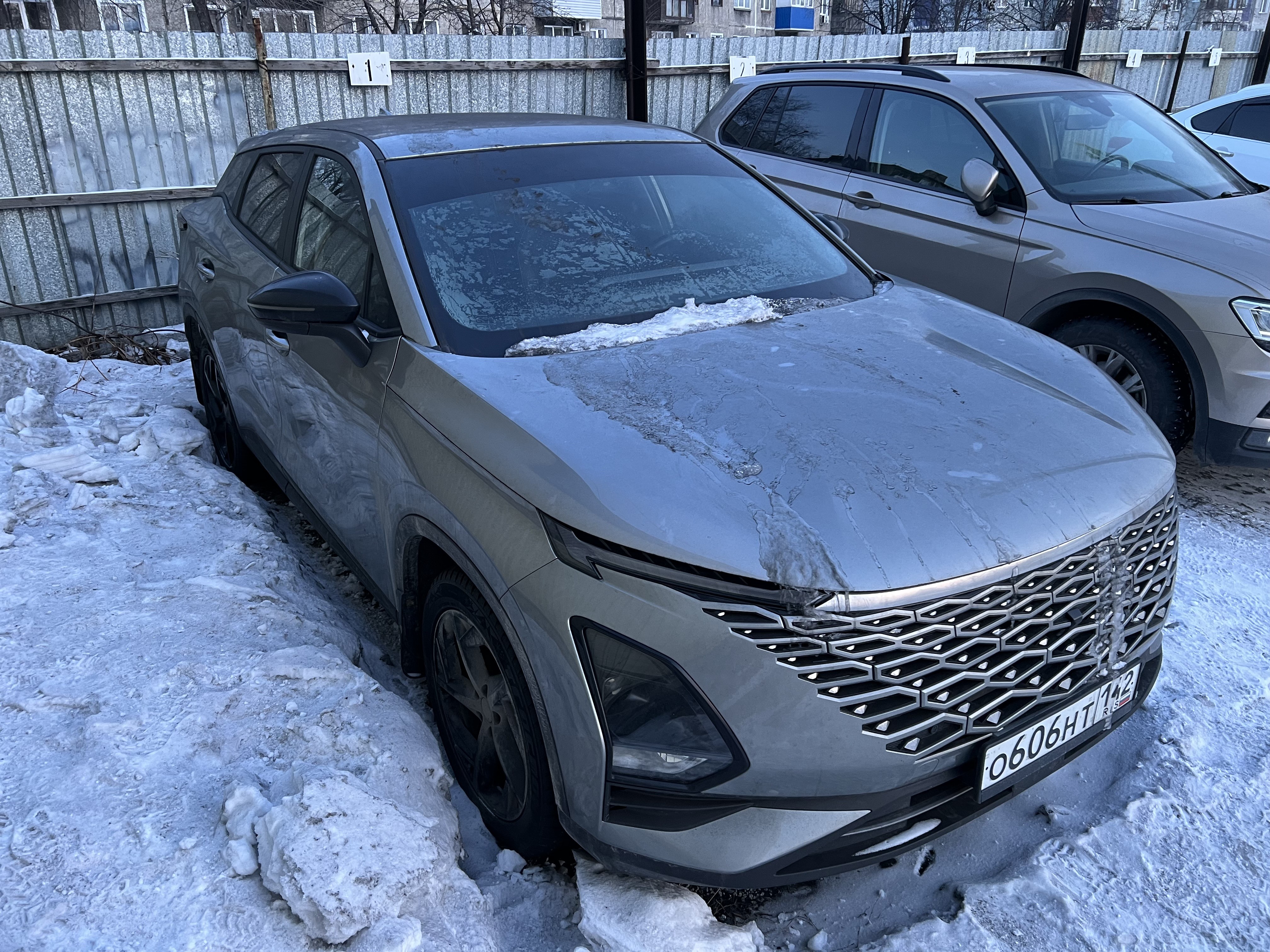 Автомобиль Omoda C5 в хорошем состоянии. Запустить двигатель, осмотреть подкапотное пространство, багажное отделение и салон не удалось по причине отсутствия ключей. На момент осмотра автомобиль в загрязненном состоянии (присутствует слой наледи). Кузов автомобиля с повреждениями: ➢задний бампер- вмятина, царапины, сколы ➢задняя правая дверь- вмятина, царапины, сколы Автомобиль в заводском окрасе (измерения толщиномера в миллиметрах). Фары, задние фонари, стекла визуально в хорошем состоянии, имеются дефекты в виде царапин. Зимние шины в хорошем состоянии. Легкосплавные диски в хорошем состоянии, имеются дефекты эксплуатации в виде царапин, сколов. Данный отчет актуален на момент осмотра. Автоэксперт не даёт гарантии на возможные будущие неисправности/поломки/ошибки. Автоэксперт не гарантирует отсутствие дополнительных скрытых дефектов и точность показаний ЛКП.